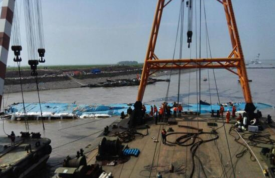 6月5日早上7時10分,現(xiàn)場救援人員正式對“東方之星”翻沉客輪實施扶正救助打撈方案。9時06分,高15米的“東方之星”號實現(xiàn)整體扶正。據(jù)現(xiàn)場救援隊伍稱,沉船水下雙利千斤頂穿引為扶正船體發(fā)揮了關(guān)鍵作用。