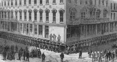 項目在1856年被認(rèn)可后,持續(xù)數(shù)年轟轟烈烈的城市改造。人們將建筑挖離地基后,用千斤頂一點點撬起來,在下方建造新的支撐。1858年第一棟建筑被抬起,重達750噸,同年有50幾棟如此量級甚至更大的建筑被抬升重建。